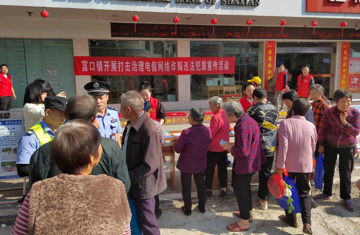 为全力维护社会治安稳定,有效遏制电信网络诈骗犯罪,提高辖区群众反诈防诈意识,切实维护群众利益,10月18日上午,富口镇针对“百万保障”“百万医疗保险”等新型骗局,联合富口派出所、司法所等部门共同开展打击治理电信网络诈骗违法犯罪宣传活动。