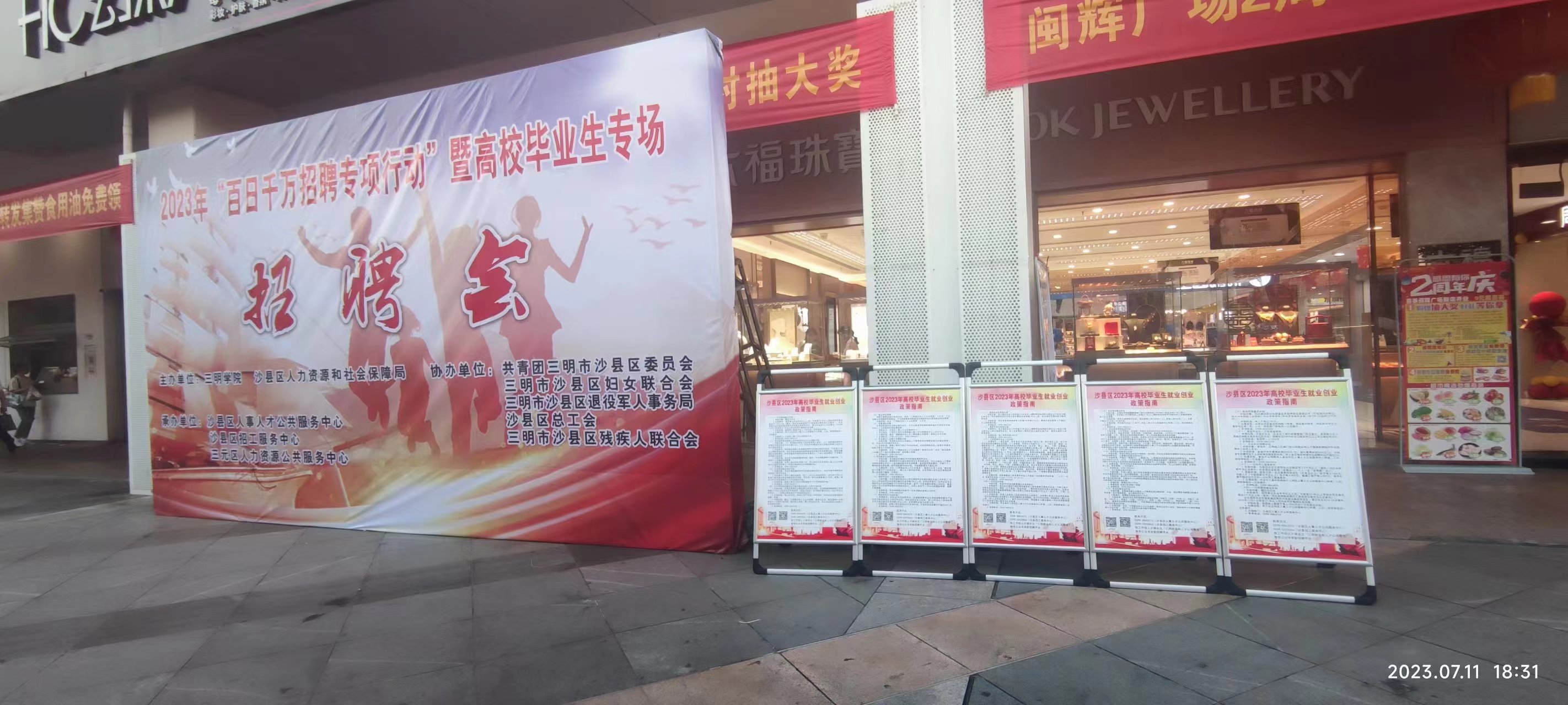 7月11日晚,以“职引未来 筑梦青春”为主题的沙县区2023年“百日千万招聘专项行动”暨高校毕业生专场招聘会在闽辉商业广场成功举办。本次招聘会利用商场周年庆活动夜间人流量大的优势,让求职者可以边逛商铺边找工作,营造轻松氛围。