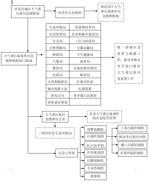 沙县区人民政府负责沙县区范围内的重污染天气应对工作的组织领导,由区人民政府牵头成立三明市沙县区城区大气重污染应急指挥部(“区大气应急指挥部”),区政府分管副区长任总指挥,三明市沙县生态环境局局长及区政府办主任任副总指挥。
