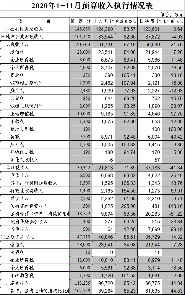 2020年1-11月预算收入执行情况