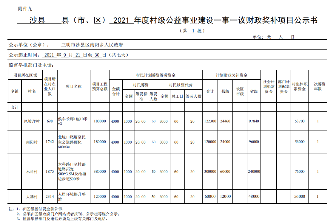 沙县区南阳乡2021年度村级公益事业建设一事一议财政奖补项目公示书