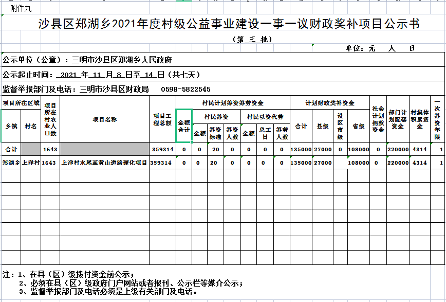 沙县区郑湖乡2021年度村级公益事业建设一事一议财政奖补项目公示书(第三批)