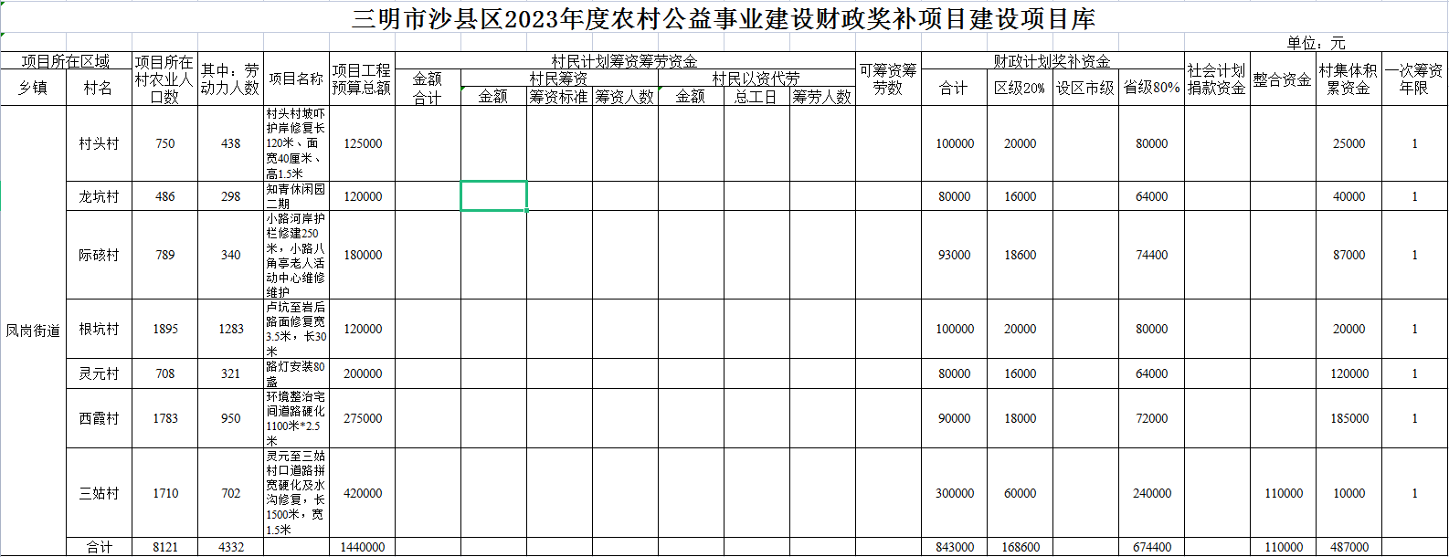 三明市沙县区凤岗街道2023年度农村公益事业建设财政奖补项目建设项目库