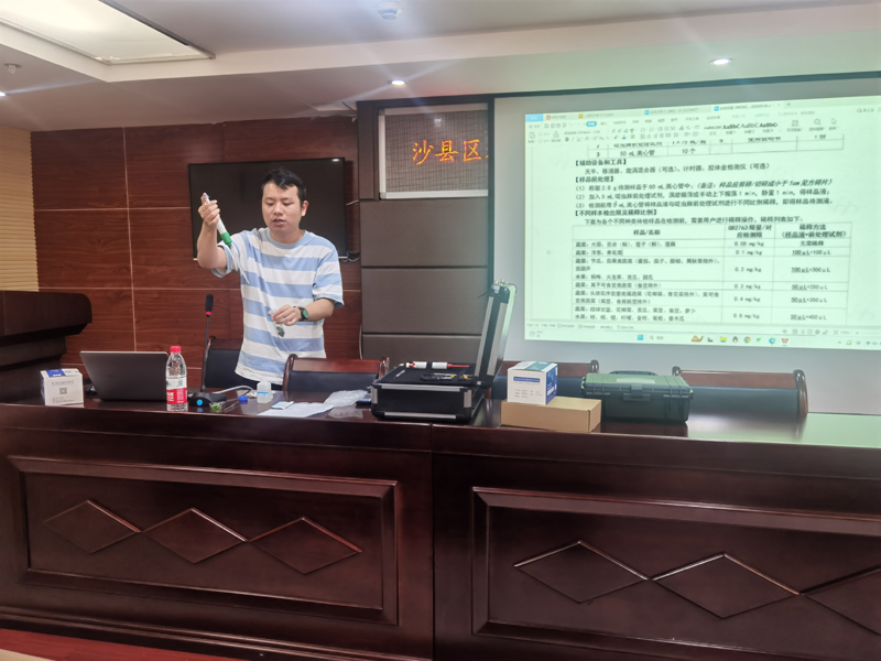 本次会议共有三项议程:一是部署2023年沙县区农产品质量安全监管工作,下达年度检测任务;二是针对生产主体的一品一码追溯系统操作培训;三是针对检测员的胶体金免疫快检技术理论和实操培训。