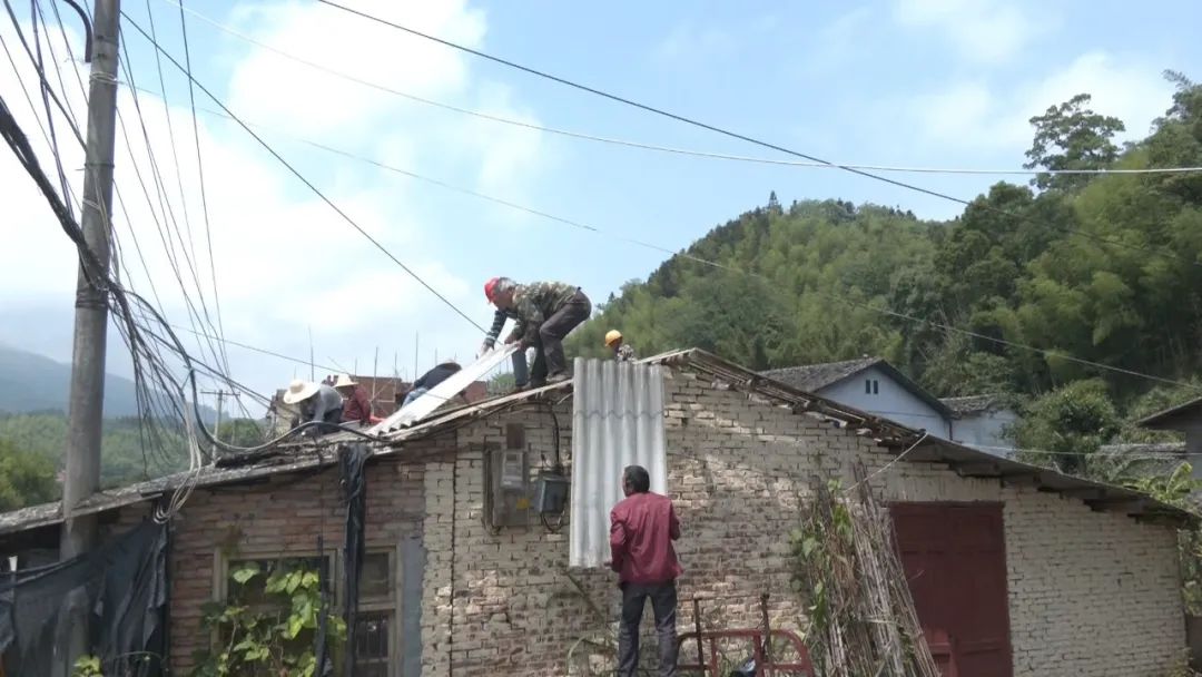 强对流天气致使虬江街道曹元、田口、后底、柱源等多个村受灾严重,许多房屋都有不同程度的损毁。23日上午,虬江街道党员干部带领群众积极开展灾后恢复自救工作,通过清理彩钢瓦、修复屋顶等,力争将灾害损失降到最低,尽快恢复正常的生产生活。