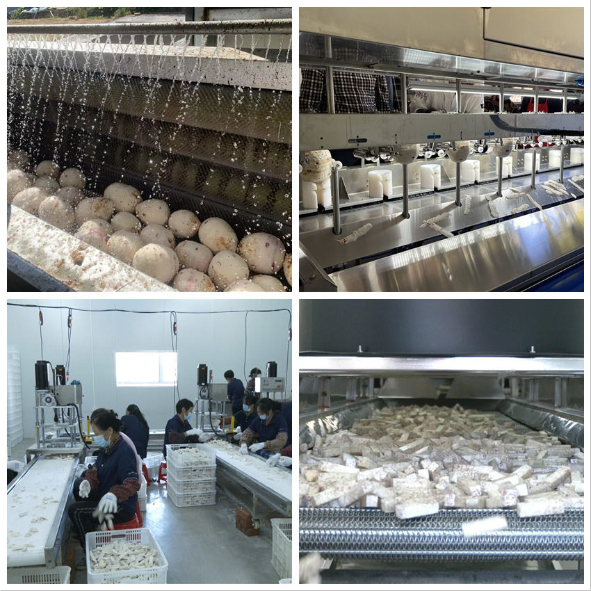 在项目生产车间可以看到,新鲜的槟榔芋被送进自动去皮清洗机中去掉外皮,随后通过机器和人工进行精细去皮,再把芋子切割成小条,最后由工人对芋条进行分类并根据客户要求进行炸制或直接包装为成品。