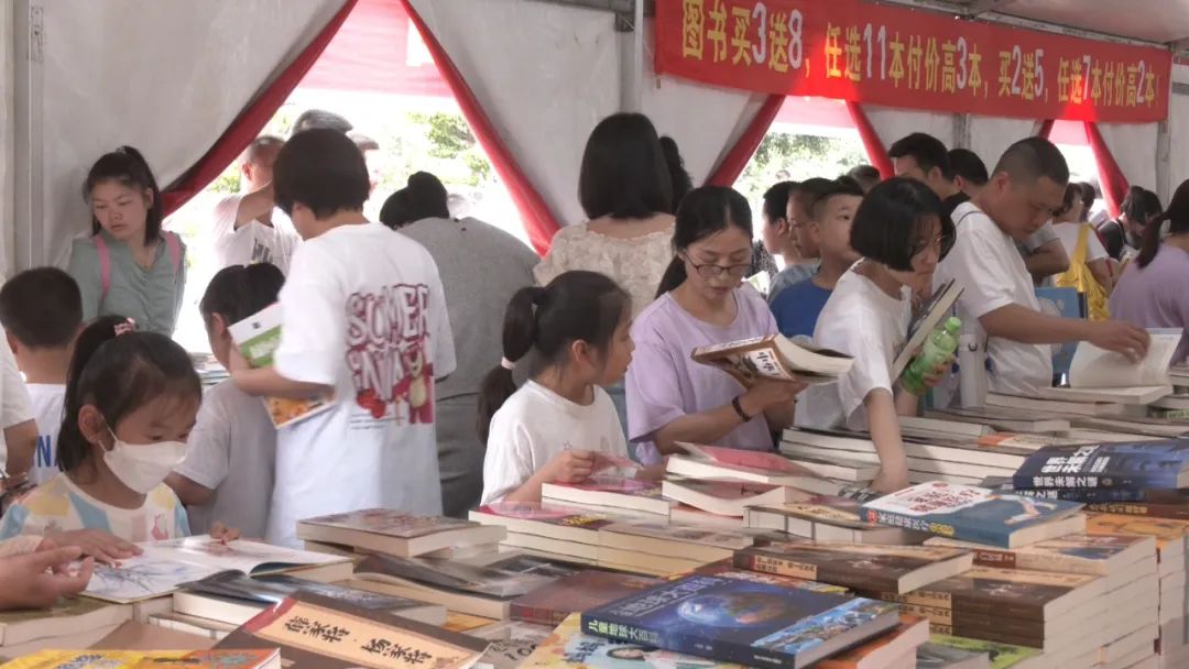 5月7日上午9时许,在活动现场,不少阅读爱好者正在选书、看书,也有很多家长陪同孩子前来开展亲子阅读。现场共有上万册图书供市民阅读、选购,图书种类丰富、题材热门,涵盖了世界名著、经典国学、幼儿绘本、儿童文学、作文素材等。
