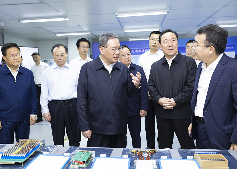 在广立微电子股份有限公司,李强听取浙江集成电路产业发展情况汇报,了解公司技术研发情况。李强强调,要坚持科技自立自强,推进集成电路全产业链发展,加强协同攻关,提高自主可控水平。