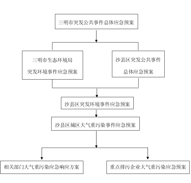沙县区城区大气重污染应急预案在预案体系中属于区级人民政府的突发事件应急预案,该体系包括:沙县区城区大气重污染应急预案、相关职能部门大气重污染应急响应方案及重点排污单位大气重污染应急保障措施。该预案属于三明市沙县区人民政府沙县区城区大气重污染专项应急预案,是《三明市沙县区人民政府突发公共事件总体应急预案》《三明市沙县区突发环境事件应急预案》的组成部分,与《三明市突发环境事件应急预案》和《三明市环保局突发环境事件应急预案》相衔接。本预案与其下级预案共同组成沙县区城区大气重污染应急预案体系。预案中涉及的相关职能部门应在该预案印发后,制定相应的部门应急响应方案。预案体系关系图见附图1。