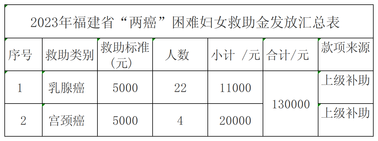 2023年福建省“两癌”困难妇女救助金发放汇总表
