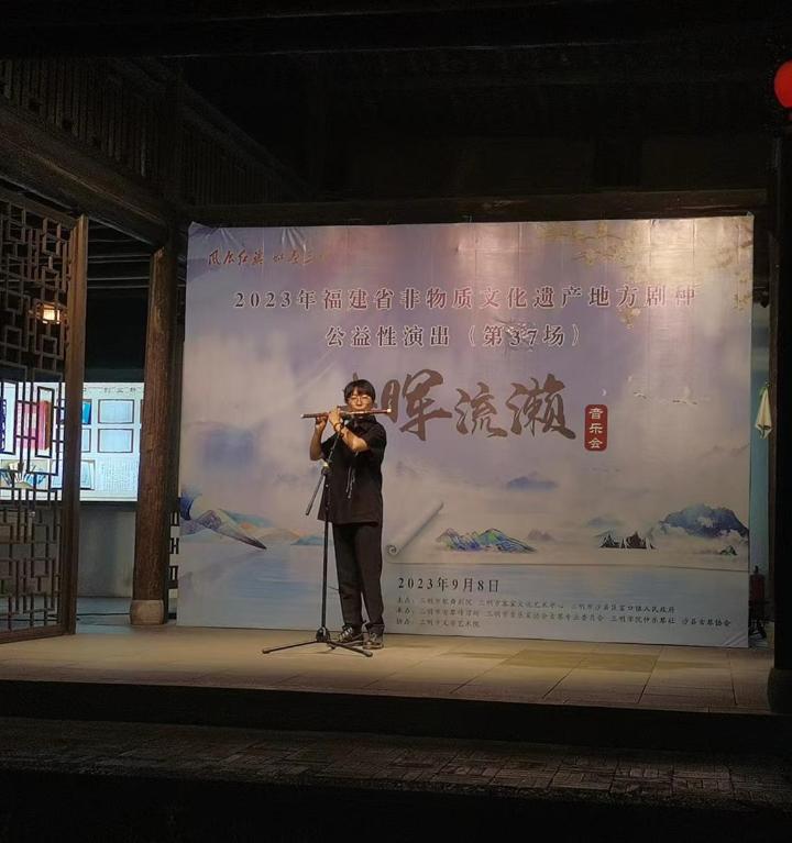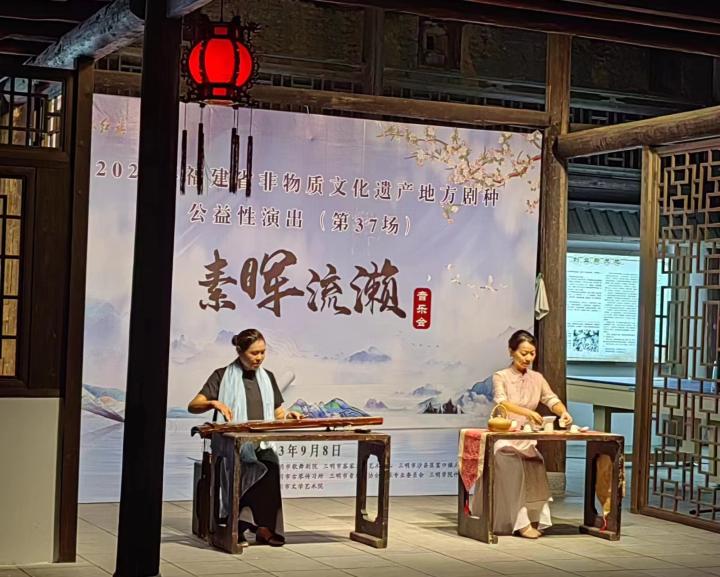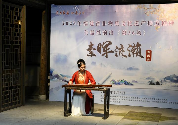 为弘扬传统文化,传承推广戏剧、古琴艺术,增强群众对非遗文化的认识,9月8日晚,由三明市歌舞剧院、三明市客家文化艺术中心和三明市沙县区富口镇人民政府主办,三明市古琴传习所、三明市音乐家协会古琴专业委员会、三明学院仲乐琴社、沙县古琴协会承办的2023年福建省非物质文化遗产地方剧种公益性演出“风展红旗 如画三明”“素晖流濑”音乐会在富口镇白溪口村史馆精彩上演,为群众带来了一场充满浓郁中国传统文化特色的视听盛宴。