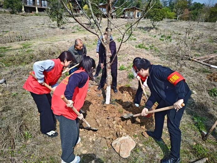 活动现场,党员们热情高涨、干劲十足,迅速投入到植树活动中。大家三人一组、五人一群,分工协作,配合默契,有的挥锹铲土,有的扶苗填坑,有的踏土夯苗,各个环节衔接有序,每道工序都认真细致。经过辛勤劳作,樱花树树苗在俞邦村“安家落户”,一排排新栽树苗昂然挺立,在春日里展现出勃勃生机。