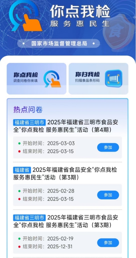 2025年1月,全国食品安全“你点我检 服务惠民生”民意征集系统正式上线。自此,消费者1年365天、每天24小时,随时都可以点选自己关心关注和希望政府部门抽检的食品。