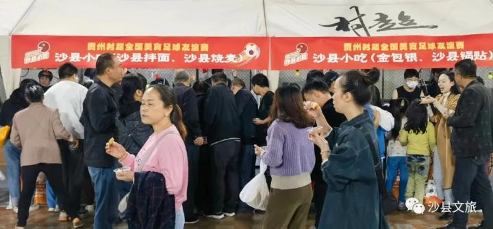 以非遗美食为媒,品地道沙县好味。全国美食足球友谊赛,是贵州“村超”的延续版,主打美食交流。沙县小吃制作技艺作为国家级非物质文化遗产,展销必不可少。此次美食“村超”的展销活动中,沙县小吃共有6个展位,展出金包银、锅贴、芋饺、扁肉、拌面、烧麦、烙粑、烫嘴豆腐、拇指煎包、小米酥十个独具特色的小吃品种和沙县小吃卡通形象IP文创产品。这些品种大都是“中华名小吃”,绝对是沙县小吃的“当家花旦”,不论是现场制作还是品鉴,都吸引了大批的游客。