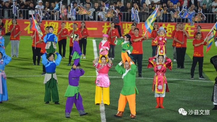 以非遗民俗为媒,展古韵虬城风采。贵州榕江美食“村超”的沙县非遗展演环节时长6分钟左右,穿插在上半场比赛和下半场比赛之间。沙县区文体和旅游局将沙县肩膀戏和夏茂游鱼进行融合编排,130多名演员呈现了一场传统且热烈的演出。