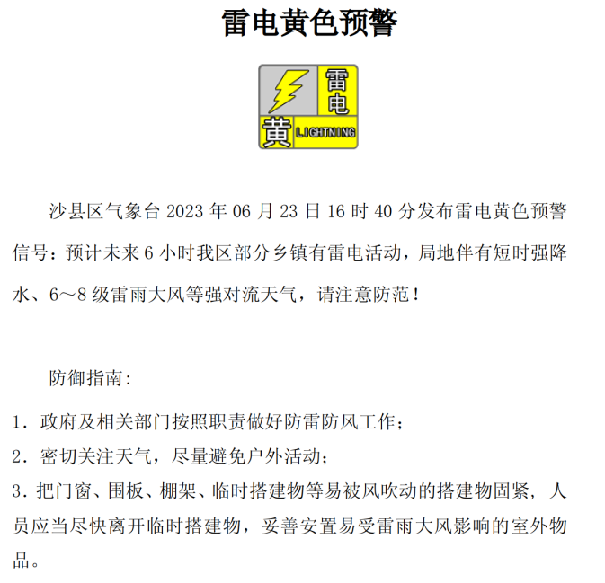 雷电黄色预警信息(2023年6月23日16时40分发布)