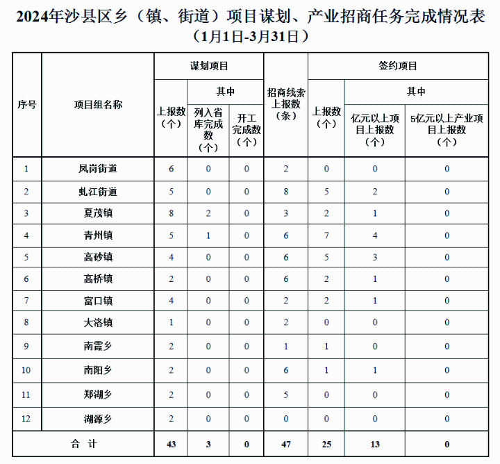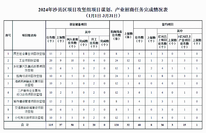 谋划储备、产业招商。1-3月,全区谋划储备项目上报数80个,招商线索上报数79条,签约项目上报数33条,具体如下: