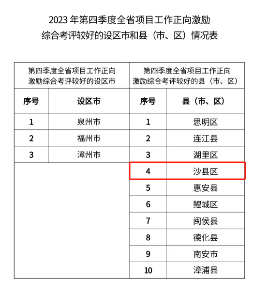 沙县区荣获2023年全省第四季度项目工作正向激励