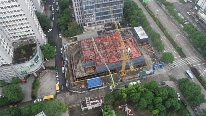 走进项目施工现场可以看到,近50名工人各司其职,正在进行一层框架柱的混凝土浇筑、二层板钢筋绑扎工作,现场一派热火朝天的施工景象。目前,项目主体建筑的地下室部分已基本完工。