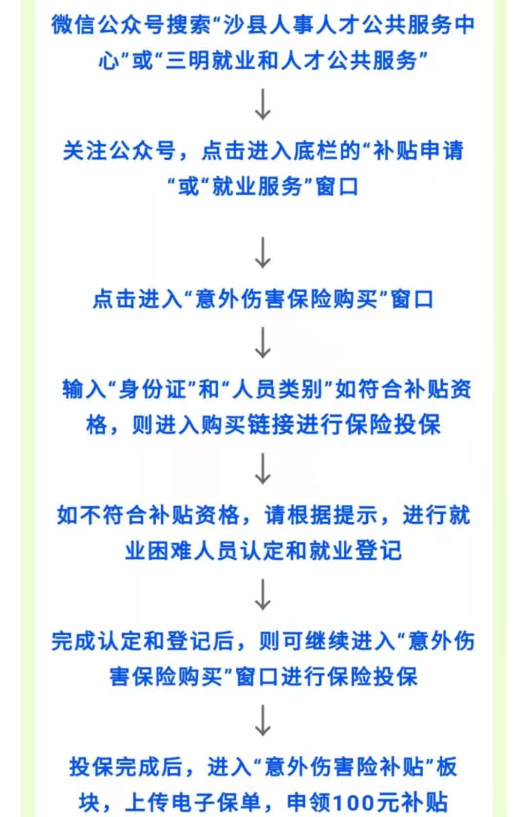 就业困难人员、毕业5年内高校毕业生灵活就业人员意外伤害保险补贴开始领取啦!今年人社部门新近出台灵活就业人员意外伤害保险补贴,符合条件的人员可按照每人每年不高于100元的标准,给予最长三年的补贴。为更好地落实此项惠民政策,人保财险三明分公司积极响应,第一时间对接“三明就业和人才公共服务”平台,推出在线购买人身意外伤害保险一站式服务,并根据需求专门设计了低保费、高保额的100元意外伤害保险产品。符合条件人员购买该保险产品后,可获得100元的全额保费补贴,不花一分钱即可获得最高14万元的保险保障。