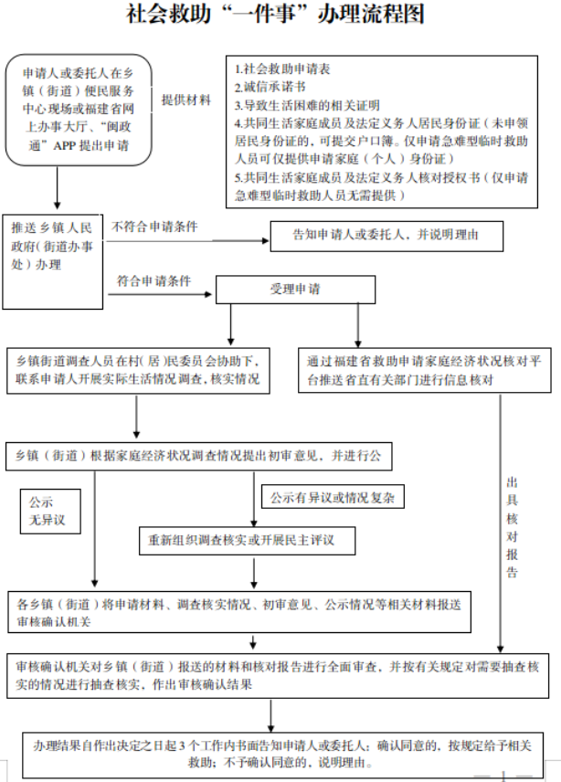 - 符合条件的由有关部门进行受理申请,包括①乡镇街道调查人员在村(居)民委员会协助下联系申请人开展实际生活情况调查核实情况;②通过福建省救助申请家庭经济状况核对平台推送省直有关部门进行信息核对;
