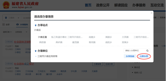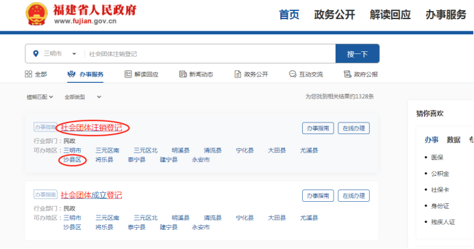 4、索栏搜索输入:社会团体注销登记→办事服务→找到相应登记,点击沙县区→点击立即办理→自动跳转页面(访问第三方网站)。