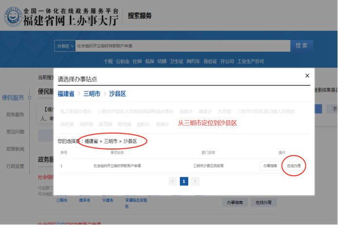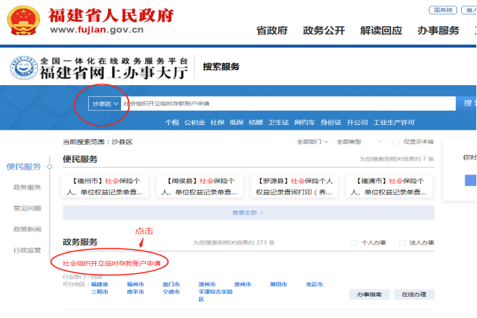 3、搜索栏搜索输入:社会组织开立临时存款账户→政务服务→定位到沙县区,找到相应登记,点击→在线办理→用法人闽政通手机号登录(不用二维码,选个人登入,短险验证码登入)→跳转页面(访问第三方网站),按提示登录→选择民办非企业单位,确定。