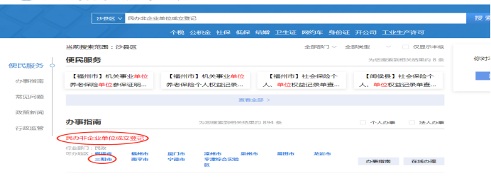 3、搜索栏搜索输入:民办非企业单位成立登记→政务服务→定位到沙县区,找到相应登记,点击→在线办理→用法人闽政通手机号登录(不用二维码,选个人登入,短险验证码登入)→跳转页面(访问第三方网站),按提示登录。