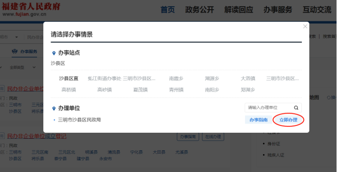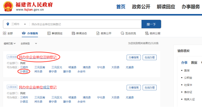 4、索栏搜索输入:民办非企业单位注销登记→办事服务→找到相应登记,点击沙县区→点击立即办理→自动跳转页面(访问第三方网站)。