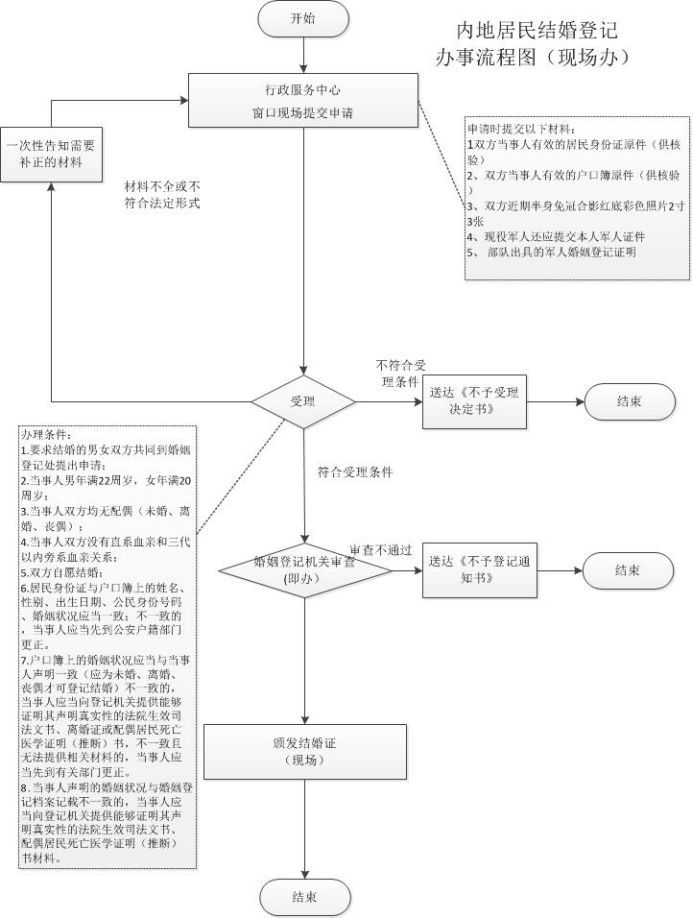 符合结婚条件的男女双方共同到婚姻登记处提出申请,材料齐全情况下即办。