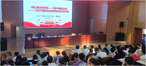 连日来,《闽山闽水物华新——习近平福建足迹》在沙县区教育系统学习正酣。7月14日,在沙县第一中学阶梯教室,区教育局党办主任谢龙海应邀为300多名师生开展《闽山闽水物华新——习近平福建足迹》专题宣讲。谢龙海老师从充分认识学习重大意义、深入把握丰富内涵、切实把《闽山闽水物华新--习近平福建足迹》转化为学习成果等三个部分,与大家分享了习近平总书记在福建工作17年半,走遍福建的山山水水,留下很多前瞻性、开创性、战略性的实践探索和理论创新的点滴故事。宣讲深入浅出,语言朴实,调动了大家的学习兴趣,大家全神贯注,认真聆听,仔细记录。大家纷纷表示,要深入学习宣传贯彻落实习近平新时代中国特色社会主义思想的实际举措和生动实践,将立足本职、担当进取,以实际行动迎接党的二十大胜利召开。