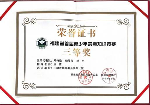 据悉,2023年6月26日,沙县区金沙高级中学应芷老师带领林明、赖琴梅、邓诗怡三位同学代表三明市公安局、三明市禁毒办参加“青春不‘毒’行 携手向未来”福建省首届青少年禁毒知识竞赛,经过五轮激烈的比拼,荣获三等奖。