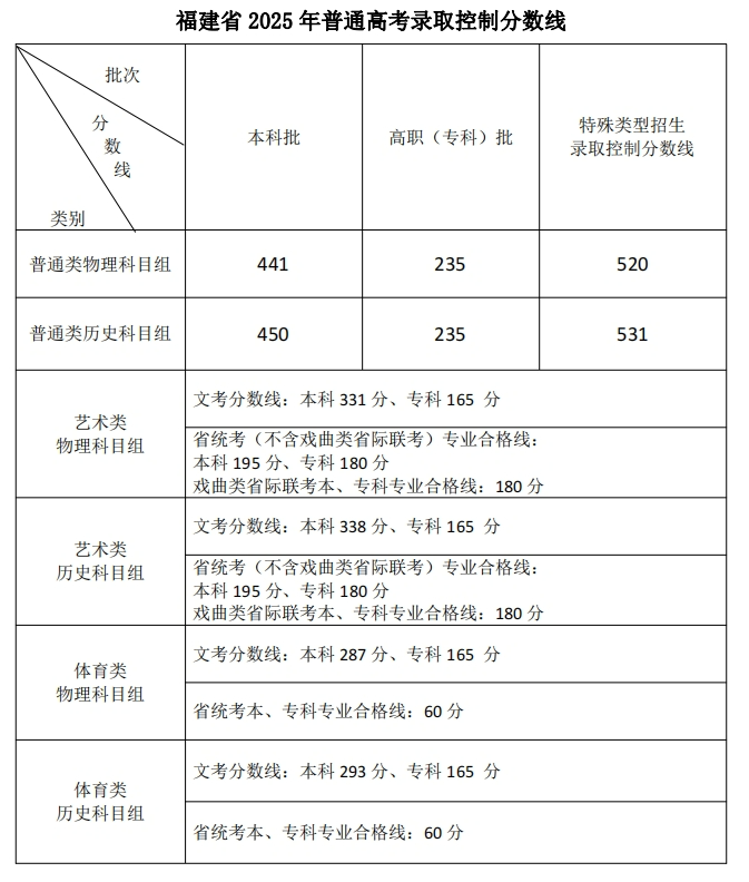 6月24日下午,福建省高等学校招生委员会召开全体会议,研究确定我省2025年普通高考切线方案,部署高招录取工作。经会议研究决定,福建省2025年普通高考各类录取控制分数线具体如下: