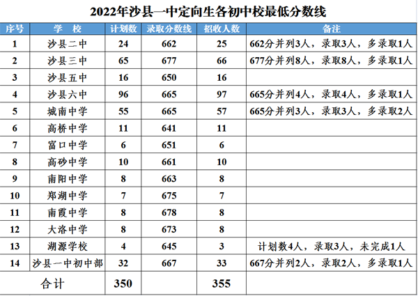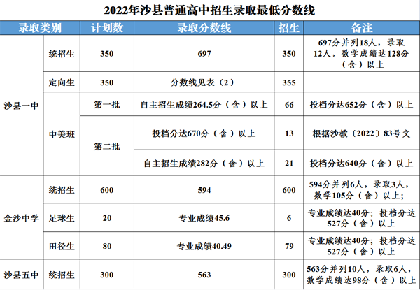2022年沙县区中考录取分数线公布