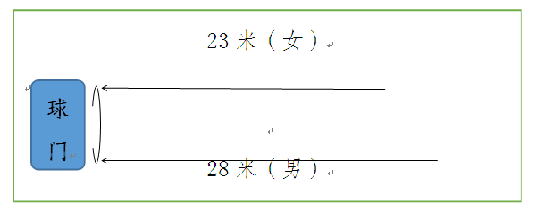1.考试方法:如图所示,传球目标区域由一个室内五人制足球门(球门净宽度3米,净高度2米)和以球门线为直径(3米)画的半圆组成,圆心(球门线中心点)至起点线垂直距离为男子28米,女子23米。考生须将球置于起点线上或线后(线长5米,宽0.1米),向目标区域连续传球6次,左右脚均可,脚法不限。
