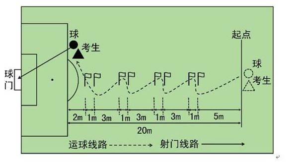 1.考试方法:如图所示,从罚球区线中点垂直向场内延伸至20米处,画一条平行于球门线的横线作为起点线。距罚球区线2米处起,沿20米垂线共插置8根标志杆。考生将球置于起点线上,运球依次绕过8根标志杆后起脚射门,球动开表,当球从空中或地面越过球门线时停表,记录完成的时间。凡出现漏杆、射门偏出球门,球击中横梁或立柱弹出,均属无效,不计成绩。每人测试2次,取最好成绩。