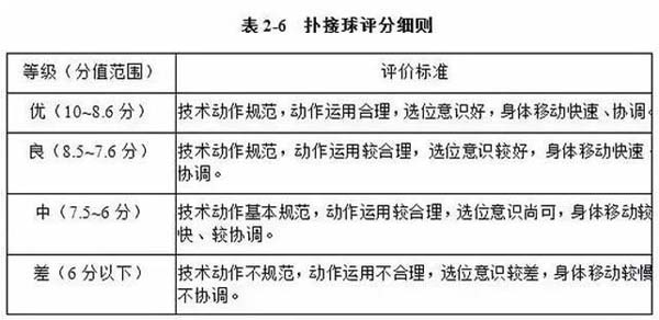 2.评分标准:考评员参照扑接球评分细则(表2-6),独立对考生进行技术技能评定。采用10分制评分,以10分制的最终得分乘以2为最后得分,分数至多可到小数点后1位。