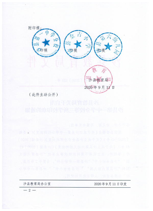 沙县教育局关于启用沙县第一中学分校等三所学校印章的通知