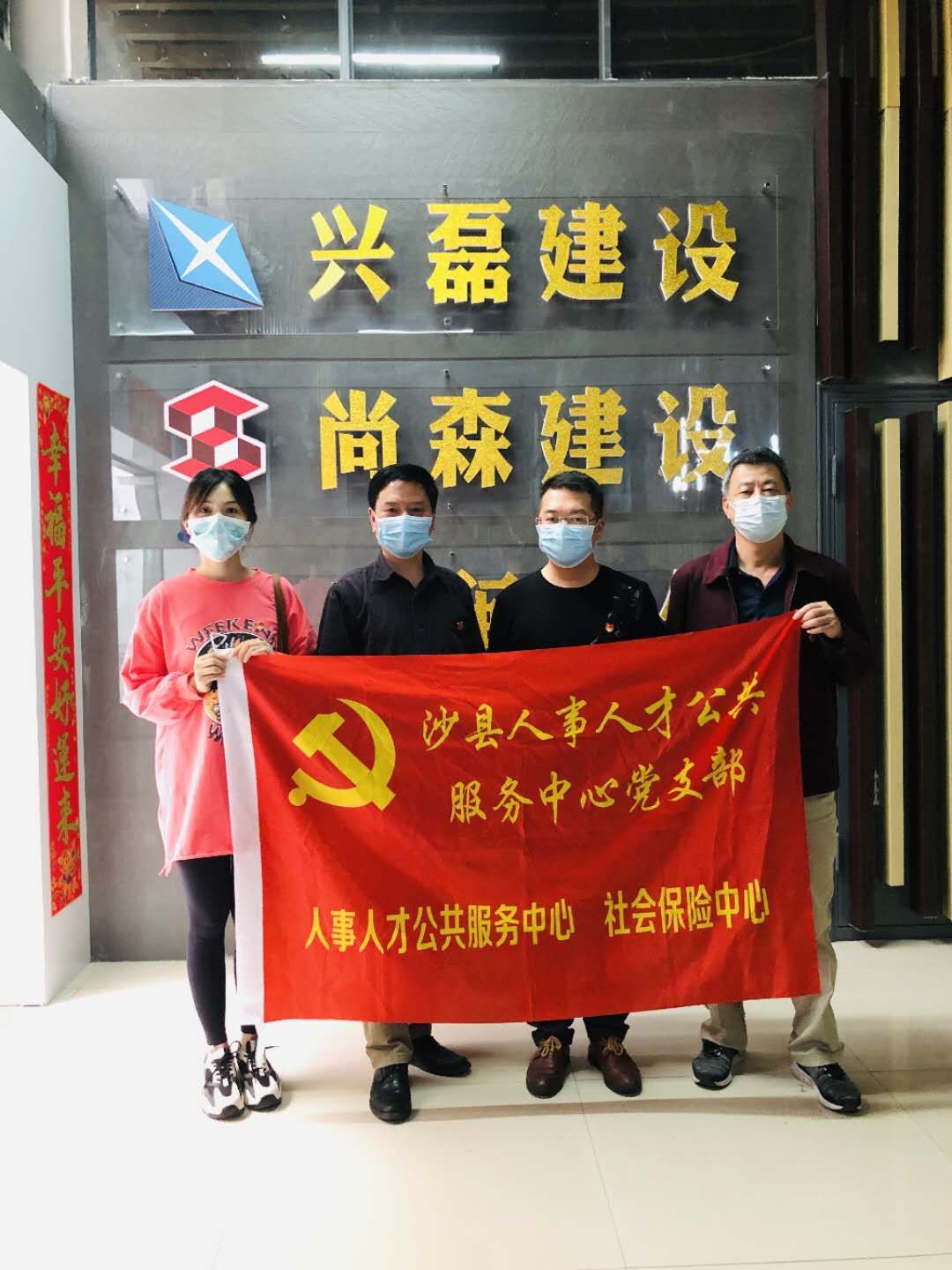 为更好的推进企业复工复产,广泛宣传社保政策法规,4月28日,沙县人事人才公共服务中心党支部组织党员志愿者深入兴磊建设和尚森建设2家建筑公司开展社保政策宣传活动。