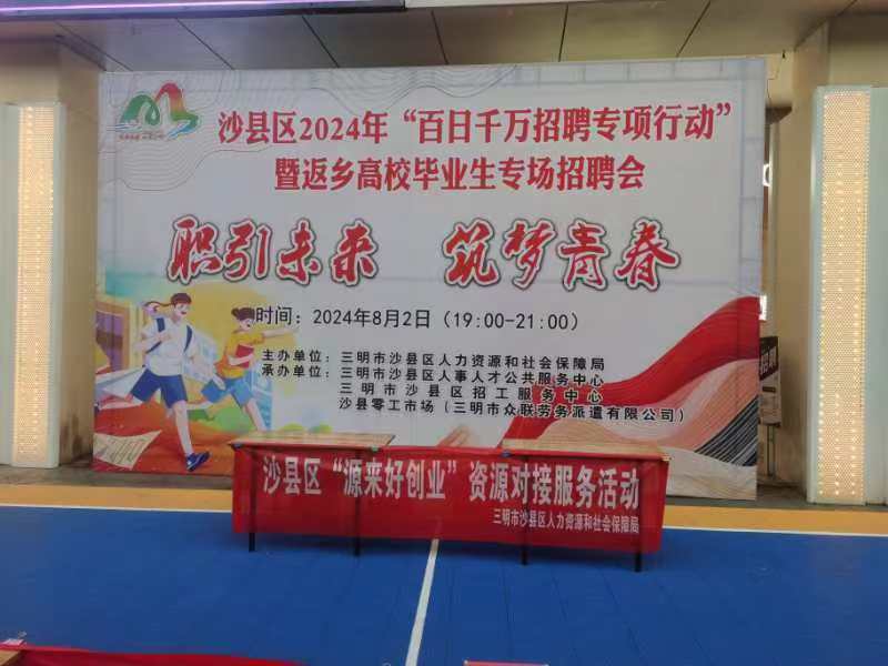 为优化高校毕业生等青年群体就业服务,沙县区人社局、三明高新区管委会于2024年8月2日晚在闽辉商业广场前举办以“职引未来 筑梦青春”为主题的2024年沙县区“百日千万专项行动”暨返乡高校毕业生专场招聘会。