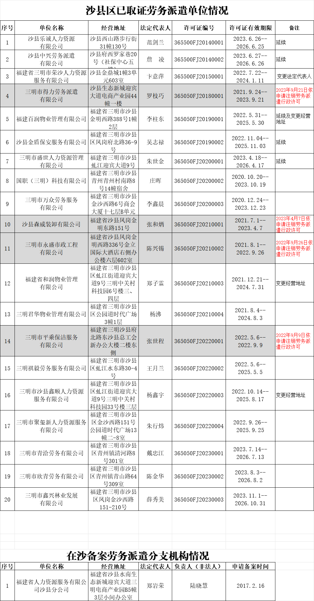 沙县区已取证劳务派遣单位情况及在沙备案劳务派遣分支机构情况