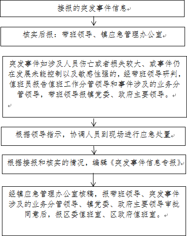 二、发生一般事故,但有可能升级为较大以上事故或敏感性强的,镇主要领导、业务分管领导、相关业务股室、应急人员赶赴现场处置,并按照应急处置要求报区委值班室、区政府值班室和区应急指挥中心。