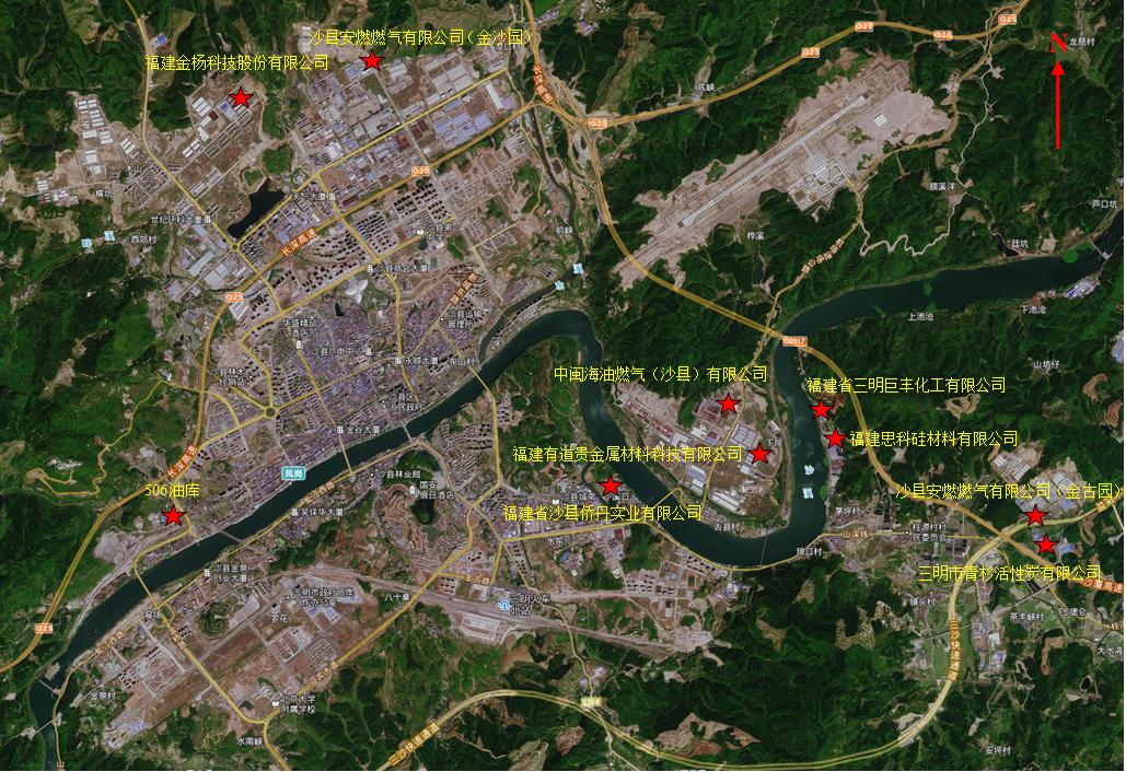 城区内主要工业污染源为:福建金杨科技股份有限公司、沙县安燃燃气有限公司、中闽海油燃气(沙县)有限公司、福建省沙县侨丹实业有限公司、福建有道贵金属材料科技有限公司、福建省三明巨丰化工有限公司、福建思科硅材料有限公司、三明市青杉活性炭有限公司和506油库。