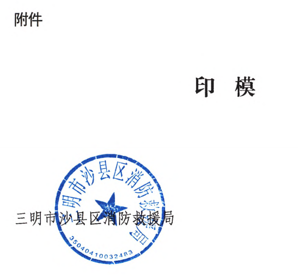 因机构改革,我区调整组建三明市沙县区消防救援局。根据《福建省人民政府办公厅贯彻国务院关于国家行政机关和企业事业单位社会团体印章管理规定的通知》(闽政办〔2000〕64号),自发文之日启用“三明市沙县区消防救援局”印章。