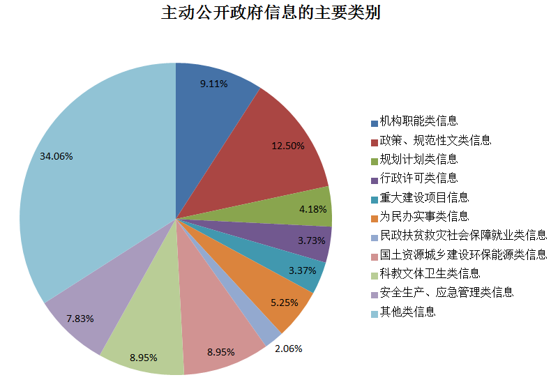 主动公开的政府信息中,属机构职能类信息349条,占 9.11%;政策、规范性文类信息479条,占12.50%;规划计划类信息160条,占4.18%;行政许可类信息143条,占3.73%;重大建设项目信息3条,占3.37%;为民办实事类信息201条,占5.25%;民政扶贫救灾社会保障就业类信息79条,占2.06%;国土资源城乡建设环保能源类信息343条,占8.95%;科教文体卫生类信息343条,占8.95%;安全生产、应急管理类信息300条,占7.83%;其他类信息1305条,占34.06%。