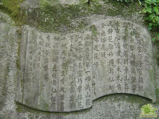 图11:洞天岩石刻:“沙阳第一”旁扇形石刻《咏洞天岩》:“峭壁凌空际,苍苔锁绿沈。千嶂擎雨暗,万壑带云深。水吼前朝寺,山存太古心。清风来木末,黄鸟静花阴。妙得游仙趣,全无俗虑侵。咏莲花峰 占断蓬莱第一峰,万山罗列五云重。巨灵巧擘拈花手,大地翻留绝世容。并蒂千秋天不老,生香九叶露初浓。倘开莲社邀仙侣,应有歌声出紫蓉。道光戊戍夏月,虬溪邑长蜀南雷三汲题。”雷三汲,字禹门,四川富顺县人。举人出身,清道光年间先后任沙县、清流知县。