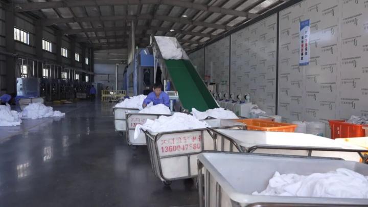 走进位于大洛镇的杰松洗涤有限公司,几台大型设备正全速运转,工人们在各自岗位上忙碌着,对清洗完毕的布草进行整理、搬运。