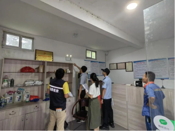 在超市、加油站、养老院等重点场所,检查组重点检查了场所的消防设施配备是否齐全有效;室内消火栓水枪和水带配备是否齐全;消防安全应急灯、疏散通道、疏散楼梯、安全出口等情况,对消防巡查记录、维保记录、值班情况进行了详细检查。