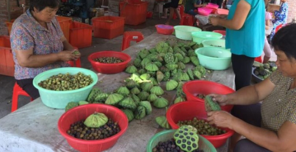 (图为贫困户在莲子加工厂剥莲子)