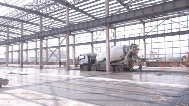 在扩建项目建设现场,50多名施工人员正在进行厂房外立面安装、厂房地面混凝土浇筑等工作,施工人员放弃休息日,抢抓晴好天气,不停工、赶进度,全力以赴奋战在项目一线。